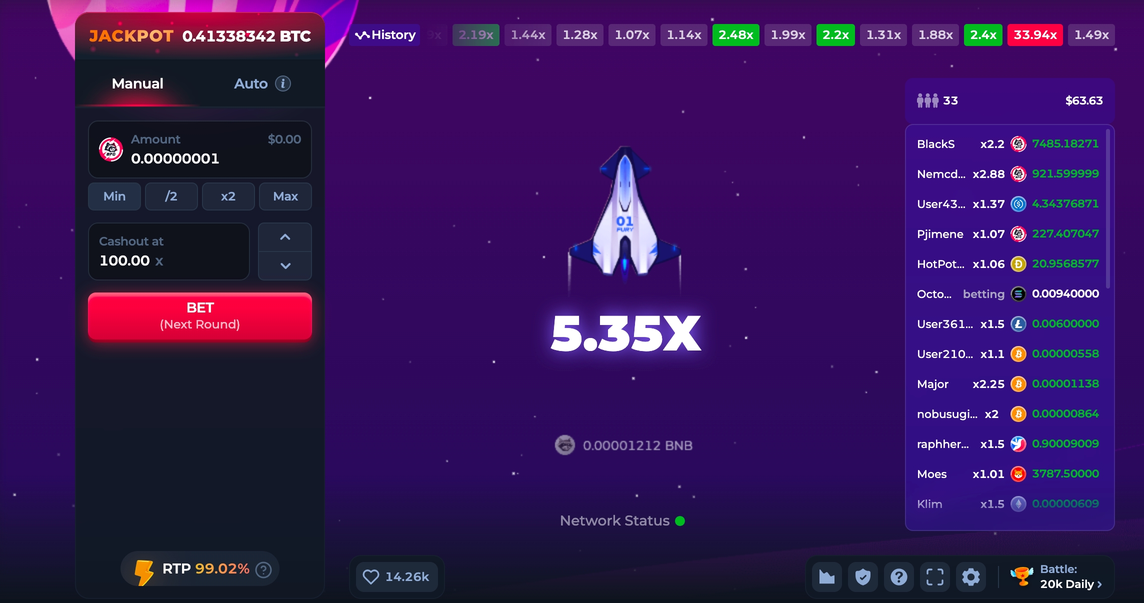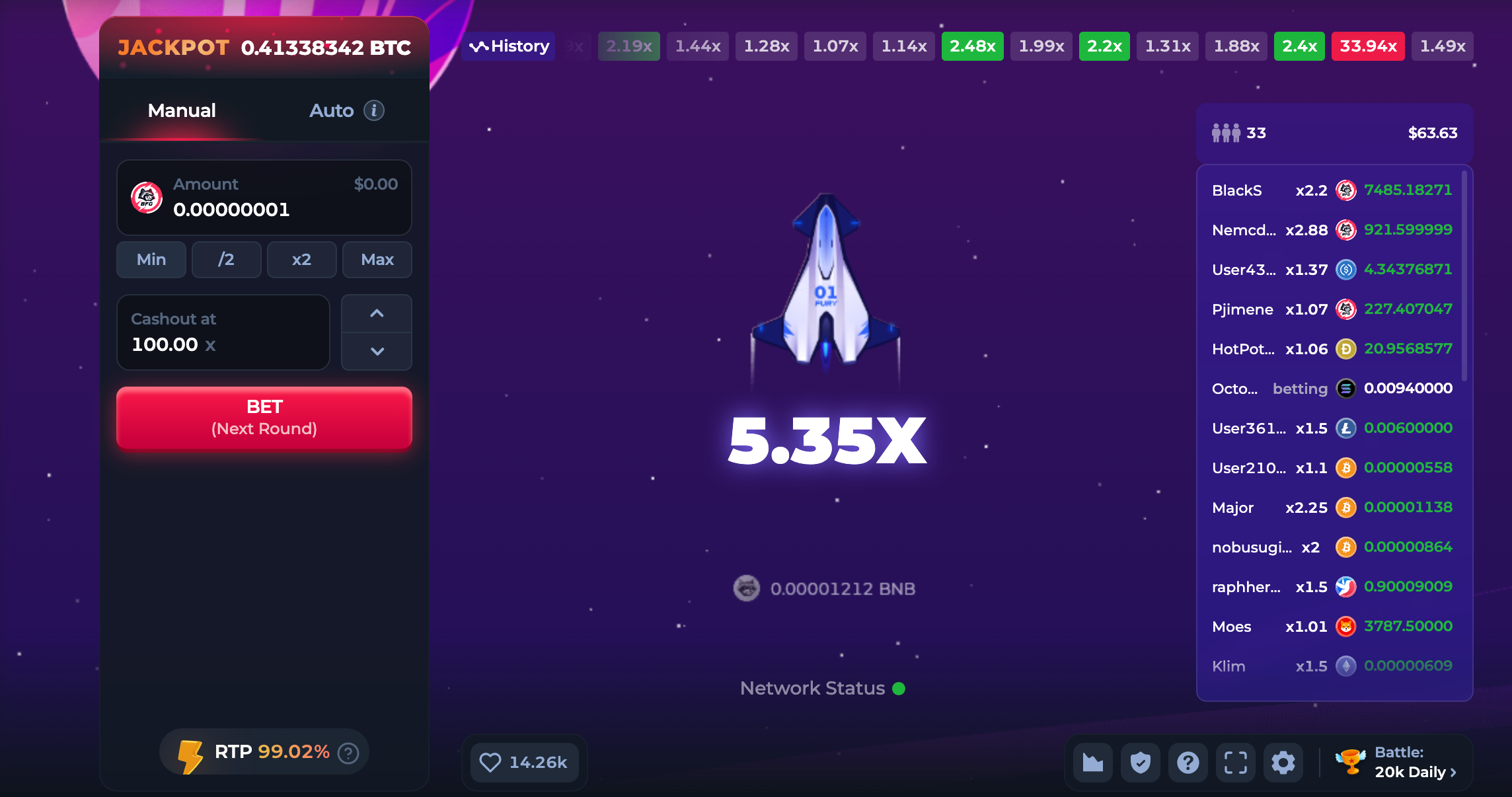 BFG tokens are available for gaming in slots and Original games. The minimum bet in Original games is 0.00000001 BFG. Enjoy the brightest games in the crypto world!
