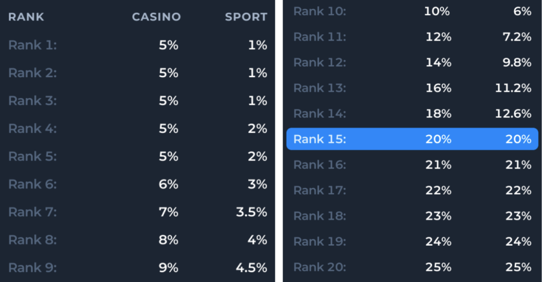 The percentage of the Bonus depends on the player’s Rank and the category of the game: