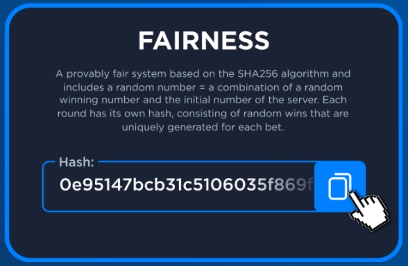 The provably fair principle is based on SHA256 technology the same as Bitcoin. The procedure of checking bet results allows you to verify the fairness of each bet.