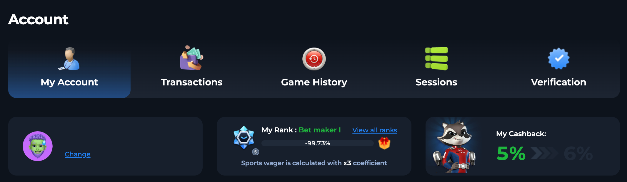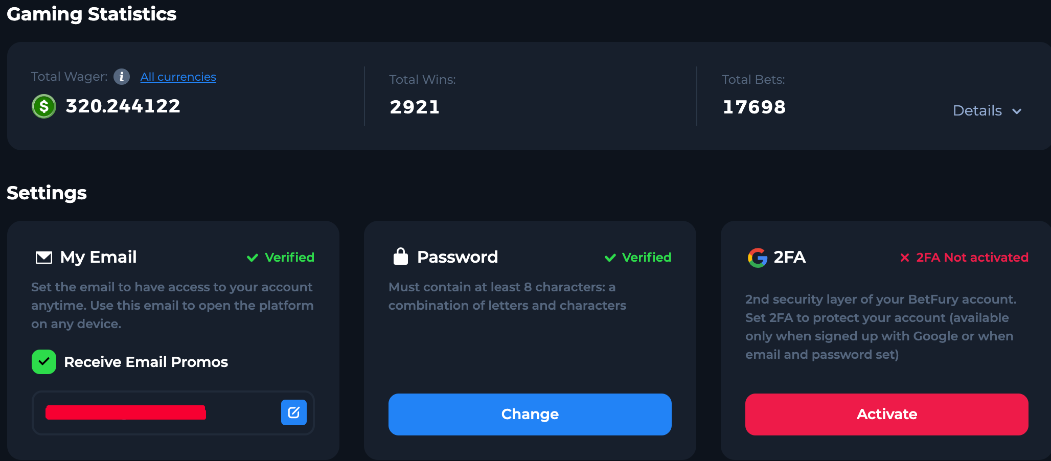 Every user on BetFury has his personal account, which is the place for setting settings and tracking gaming activity such as bets, transaction history, total wager, and personalization tools. Also, here, you can see your Rank and progress till reaching the next one. Changing an avatar is available from rank 2. You may set security related to email and pass, such as changing email, changing pass, and two-factor authorization. This provides users with maximum confidence that playing on BetFury is secure.