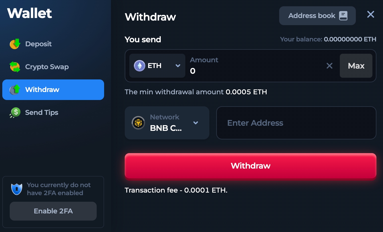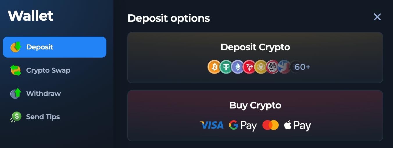 BetFury offers over 50 crypto and 4 fiat currencies for betting. There are three primary ways to refill your balance. Firstly, you can send funds from external wallets using any available network. Secondly, you can buy crypto deposit cash directly on the platform for fiat via Visa, MasterCard, etc. Finally, BetFury offers a Crypto Swap option that allows you to swap tokens with low fees without using other exchanges.