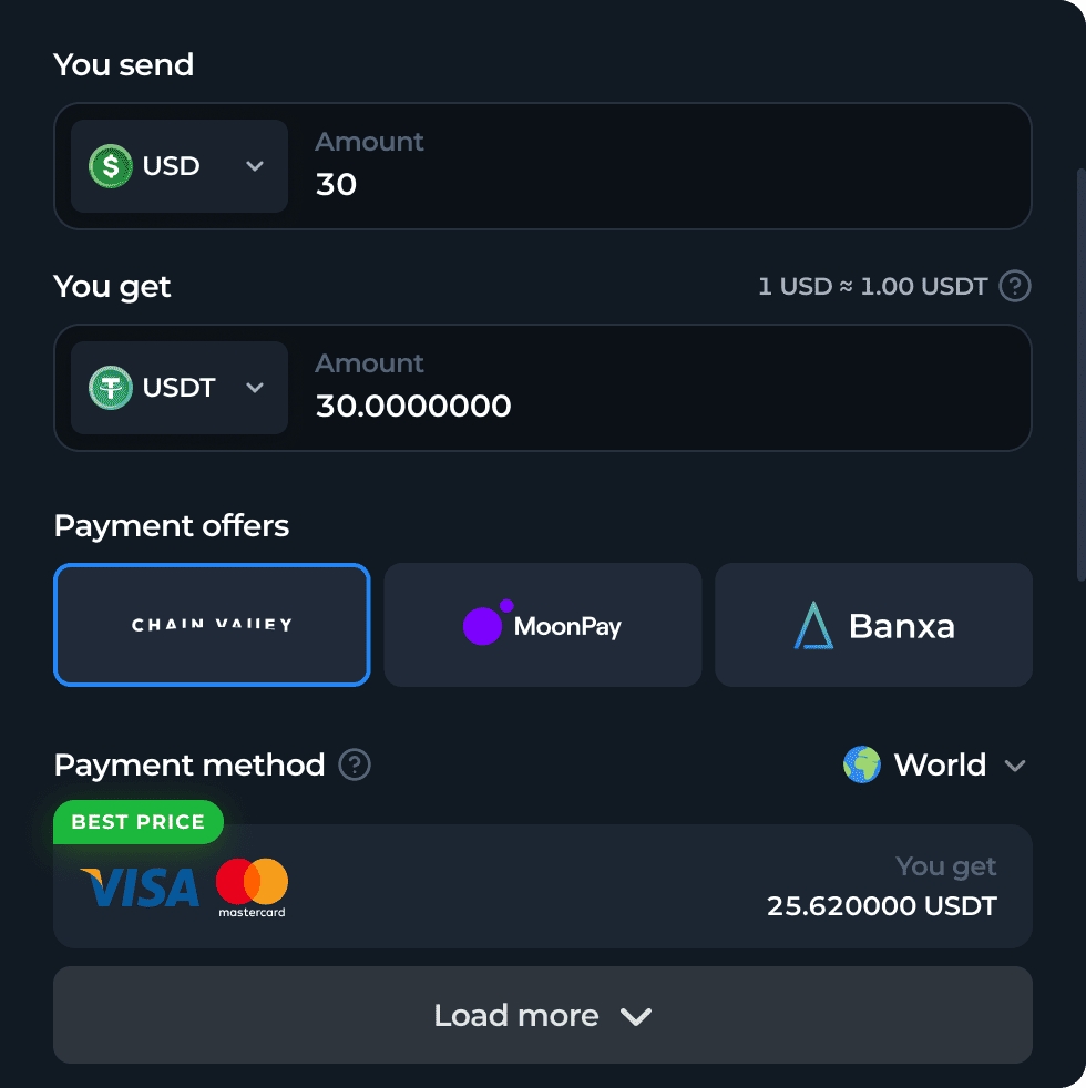 2. Fury buys USDT via MoonPay. The transaction fee (for the USD-USDT pair) will equal 14.6% for $30 and 5.7% for $100. As you can see, the bigger the amount – the lower the fees. Thus, making one big deposit is more profitable than several small ones.