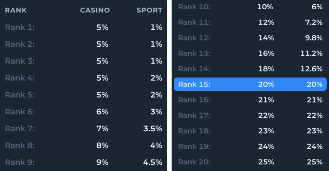 The percentage of the Bonus depends on the player’s Rank and the category of the game: